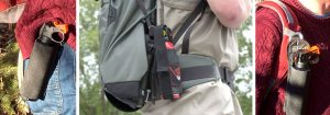 Keep Bear Spray Accessible – Carry your bear spray where you can get your hands on it in seconds. There are many types of carriers available, including waist and chest holsters and harnesses. Some people carry their bear spray in a secure cargo pocket or water bottle pouch. Never bury bear spray in your pack or carry it with the safety clip removed. When you’re in camp, keep a canister within reach in your tent and cooking area.