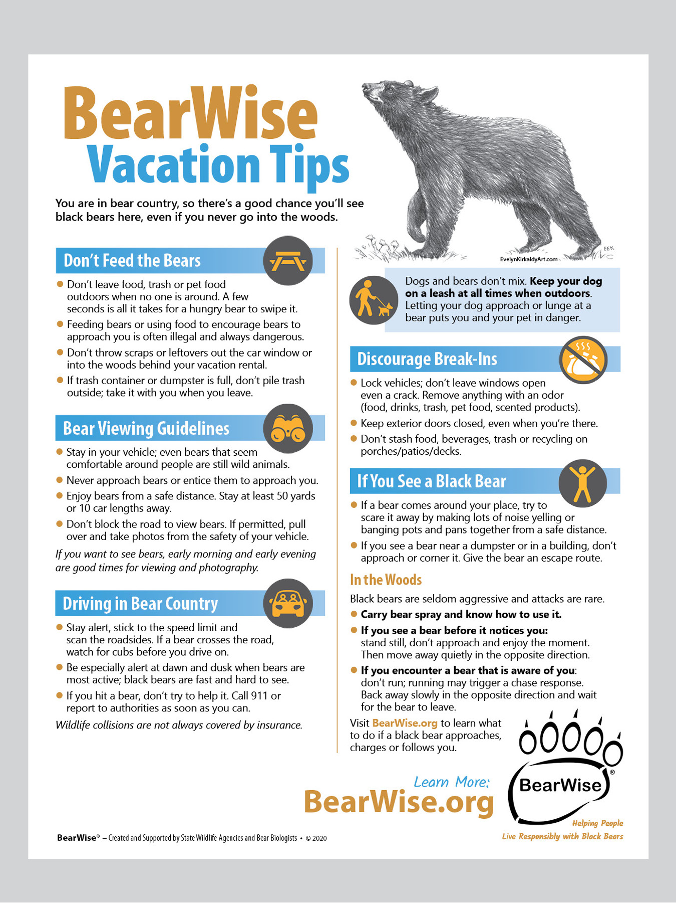 - Food and food odors attract bears, so don’t reward them with easily available food or garbage.