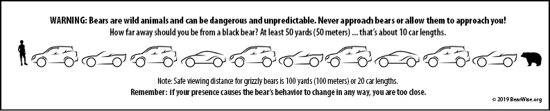 Seeing a bear in the wild is an unforgettable experience. If you’d love an opportunity to observe bears, early morning and early evening are good times for viewing and photography. Enjoy bears from a safe and respectful distance. Keep at least 50 yards – that’s ten car lengths, or half a football field – between you and the bear. If your presence causes the bear to change its behavior in any way, you are too close. Through a good pair of binoculars is the safest way to watch bears close-up.