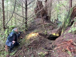Bear biologist Rich Beausoleil estimated the 9-year-old adult male bear (den opening pictured here) discovered snoozing away weighed about 280 pounds, and was doing great living off his fat reserves while denning over winter.