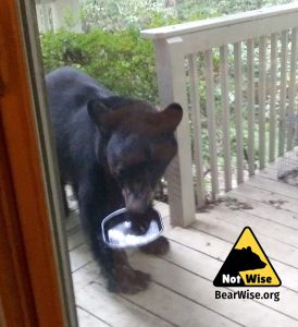 Be BearWise and store your pet food inside. If there’s no way you’re storing fifty pounds of dog food in the house, invest in a top-quality bear-resistant container, keep it latched and give the outside a nice bleach bath when you refill. Never leave pet bowls outside.