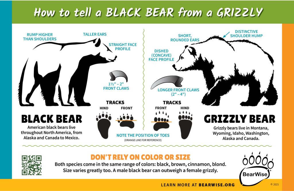 Grizzly bears have a distinct concave or dish-shaped facial profile, humped shoulders, long front claws (2 – 4 inches long) and small, rounded ears. Black bears have a straighter facial profile, more distinct (taller) ears, and shorter curved front claws (1½ – 2 inches long). Face shape, ears and claws are reliable means of telling the two species apart.