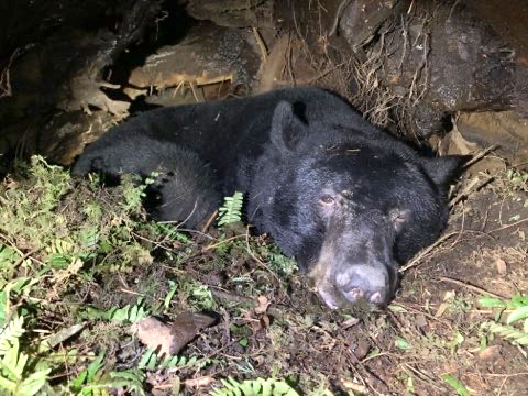 Bear biologist Rich Beausoleil estimated the 9-year-old adult male bear (den opening pictured here) discovered snoozing away weighed about 280 pounds, and was doing great living off his fat reserves while denning over winter.
